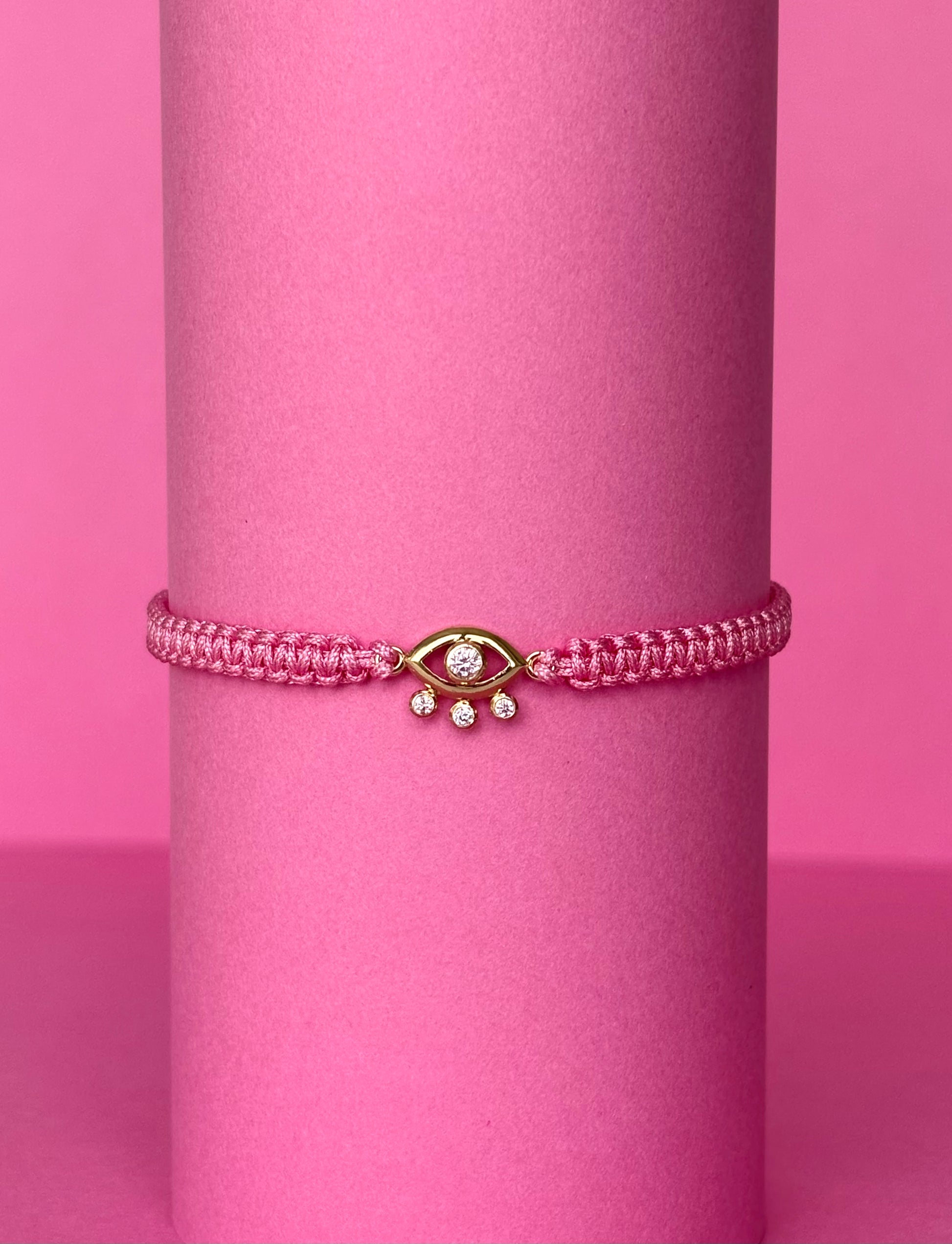 Elevate your everyday style with the Mati Bracelet in Pink, a delicate yet meaningful piece handcrafted in Montreal. This macrame-style bracelet features an elegant eye charm, symbolizing protection and intuition, adorned with pink cubic zirconia stones for a subtle sparkle. Crafted with 14K fine gold, this timeless accessory seamlessly blends sophistication with a touch of mysticism, making it a perfect addition to your jewelry collection. Adjustable for a comfortable fit, the Mati Bracelet is designed to bring both beauty and positive energy to your wrist.